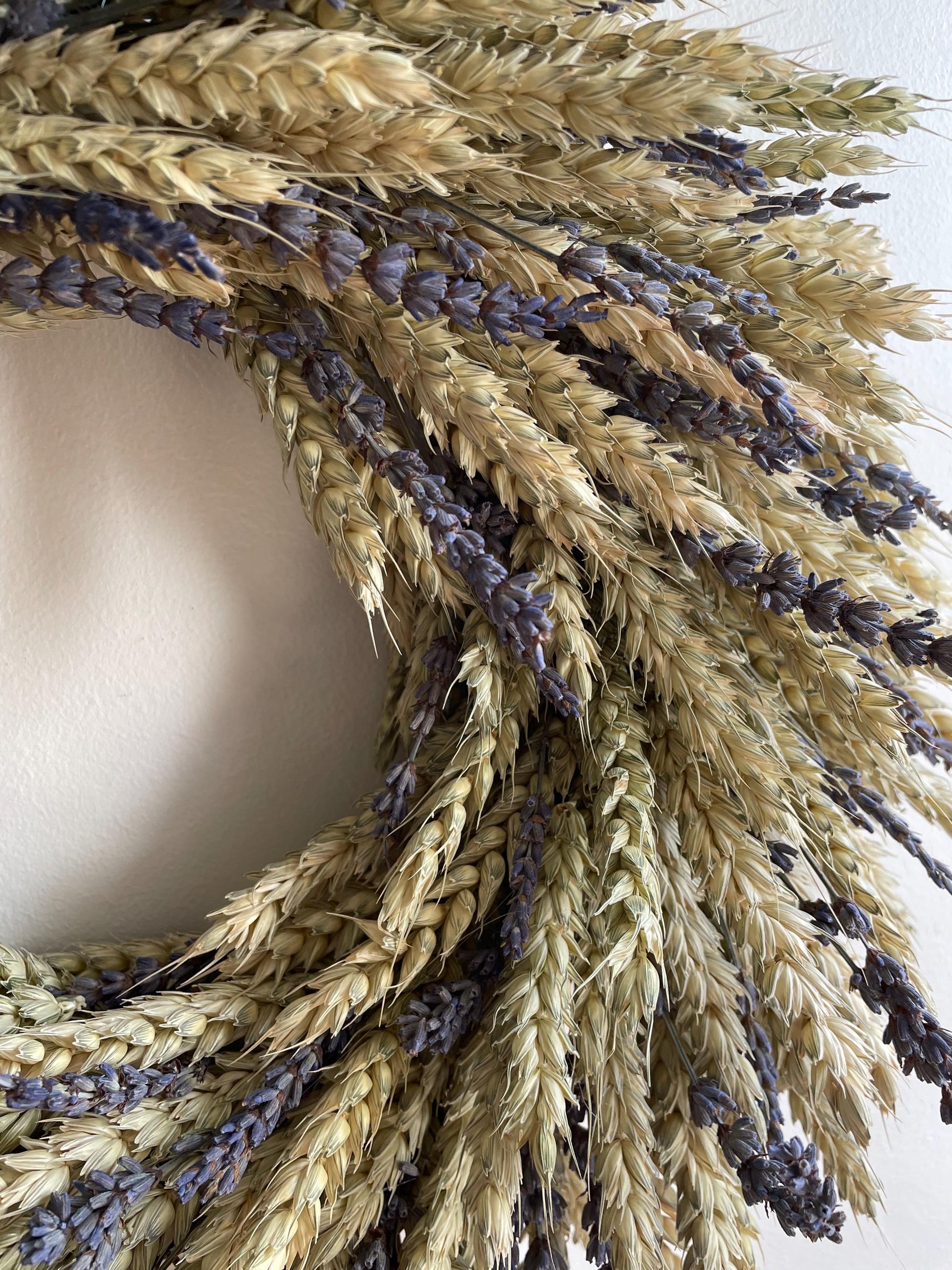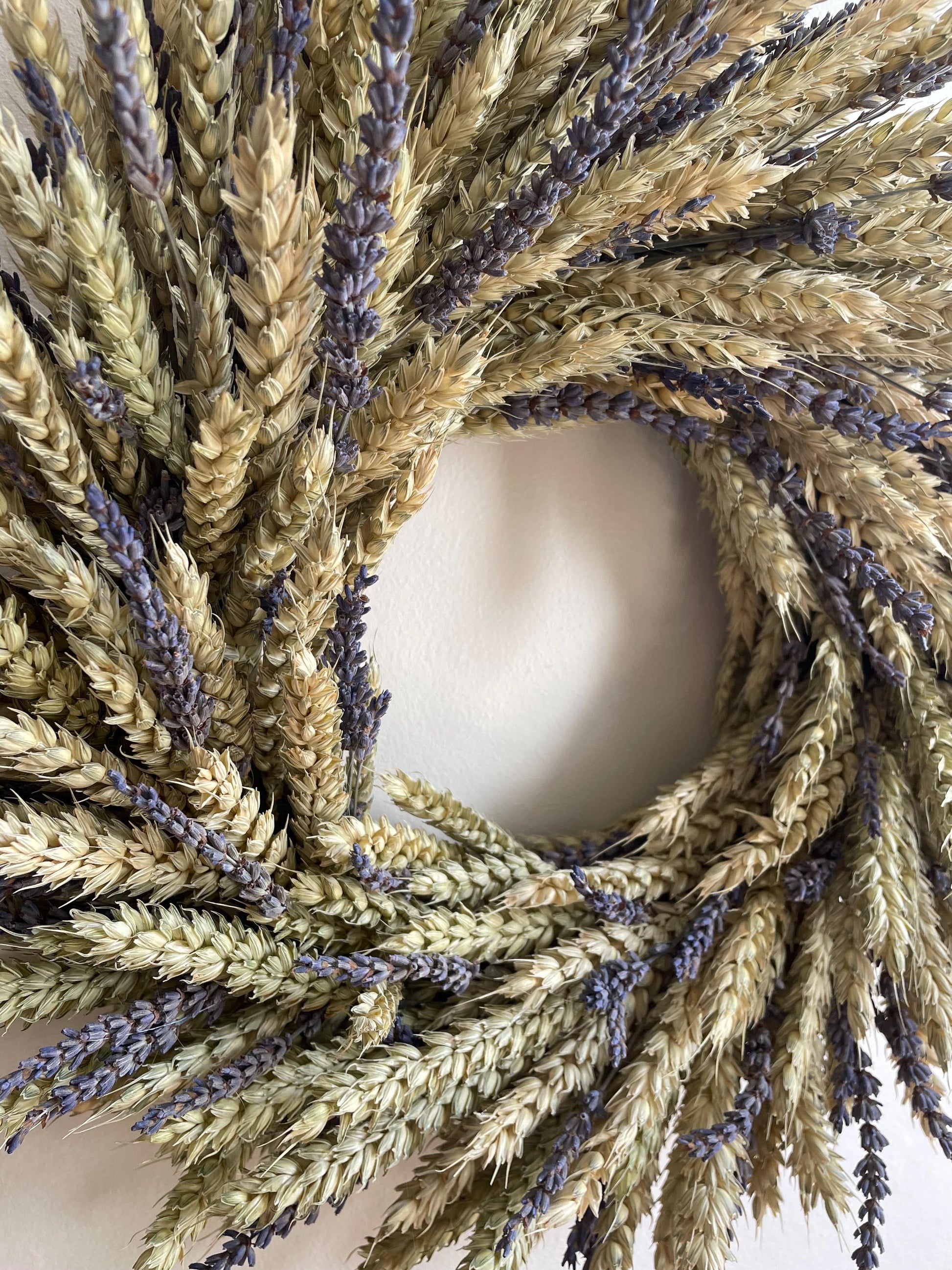Premium dried wheat and naturally scented English lavender - Handmade in the UK using sustainable materials - Designed for indoor use or covered outdoor areas - Gift-ready, ideal for housewarmings, weddings, or seasonal styling A perfect harmony of luxury and rustic charm, this wreath is a thoughtful gift or a timeless addition to your home décor. Ideal for those seeking elegant farmhouse style with a serene countryside touch.